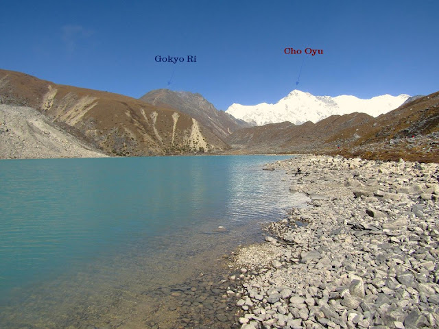 Recorremos el lado derecho del Lago, vemos el Gokyo Ri (5357 m.) y el Henjola (5925 m.)